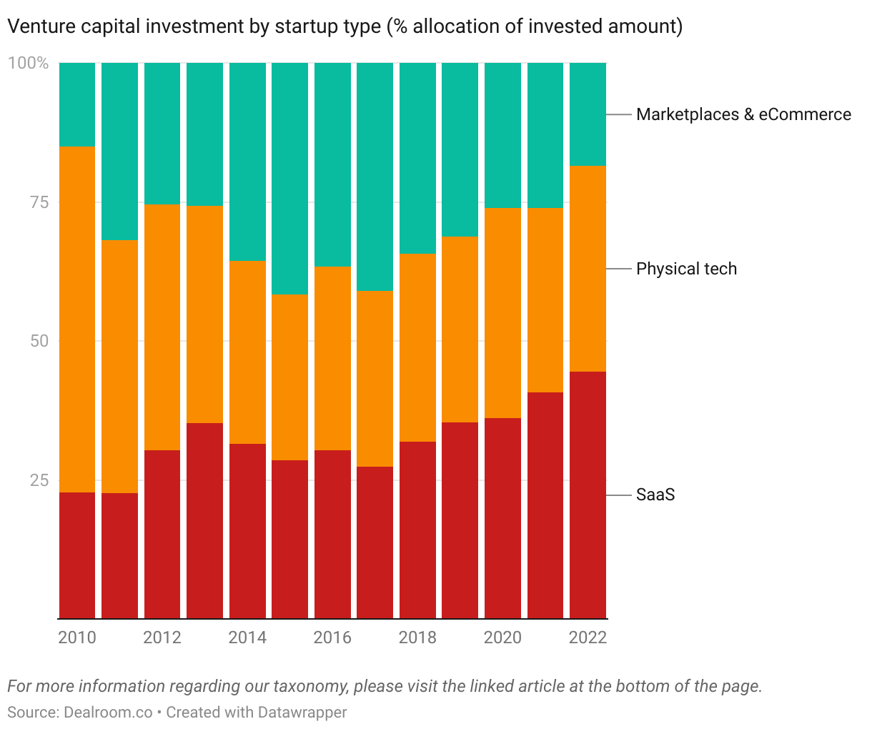 While the Dealroom data for physical technology only defines it broadly as startups producing atoms over bits, areas such as healthtech, energy, transportation, robotics are at the forefront for this decade. With the kind of supply chain stresses resulting from COVID-19 lockdowns and the resulting acute labour shortages post re-opening of economies, businesses are looking to technological advancements in software and/or hardware solutions to ease more pressure on their operations.