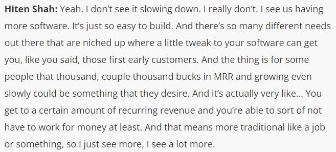 SaaS share of overall venture funding stood at 45% in 2022, up from nearly 27% of overall VC dollars in 2017. That translates into a 27% annualized growth rate on a technology that received $227B in funding last year! I don’t think SaaS as an opportunity is not going away soon, despite the calls from people on excessive SaaS. I think Hiten Shah captures it well in a recent The Startup Chat episode about the ease of building a SaaS product today, and the need for more SaaS as well.